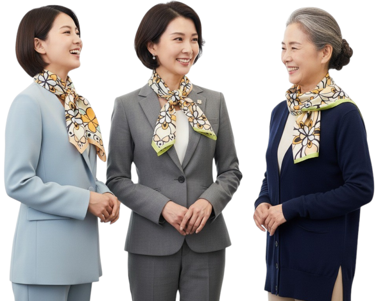 | スカーフ生地やデザイン仕様によりますが,ミニマムロットは20枚となります。 通常5週間(生地サンプルは画像確認)でお届けとなります。正式発注の前 にサンプル出しをご希望の場合には,別途2~3週間のお時間を要します。 単価は「素材」「サイズ」「色数」「数量」「製法」「縫製」の変数で割り出され ますので,ご希望の詳細をお知らせくだされば速やかにお見積りいたします。 |